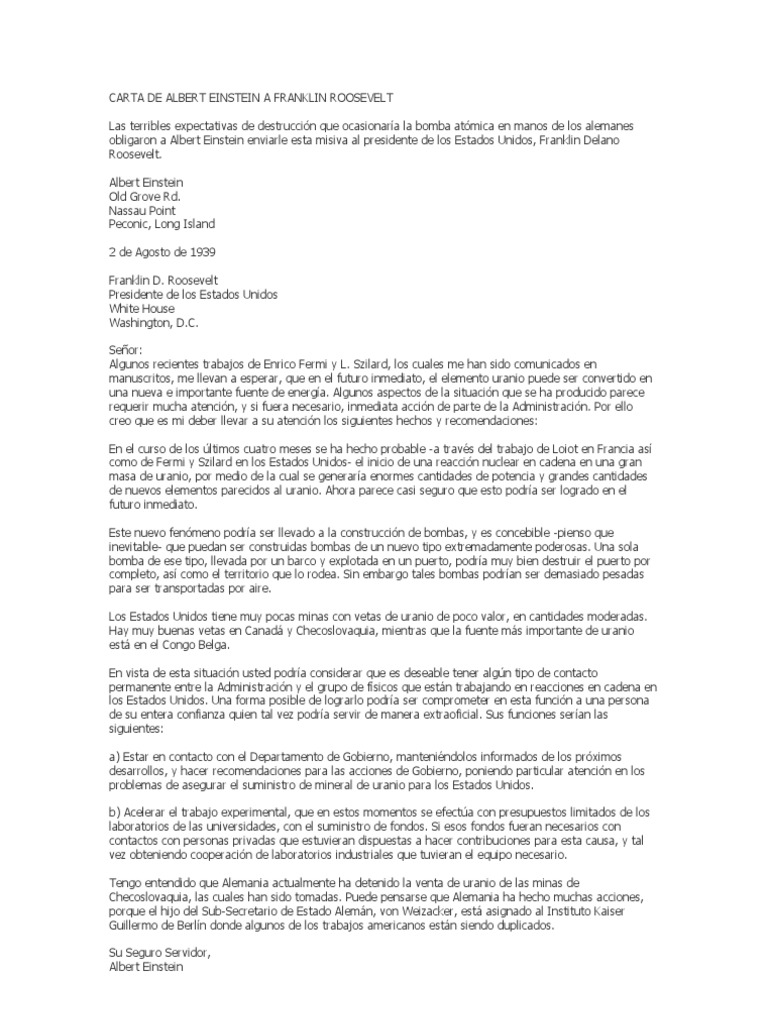 Einstein lettera a roosevelt. """SI VIS PACEM PARA BELLUM""": Il "Progetto Manhattan", la ... - Blogger Egli quindi decise nuovamente di consultare Einstein, e i due fisici scrissero una nuova lettera indirizzata a Sachs che a sua volta cercò ripetutamente di contattare Roosevelt, il quale il 5 aprile 1940 rispose a Sachs confermando la fiducia in Briggs e convocando una nuova riunione del Comitato per l'uranio per il 27 aprile. PDF An Open Letter to President Roosevelt Hon. Franklin D. Roosevelt Enc. An Open Letter to President Roosevelt By John Maynard Keynes. Dear Mr President, You have made yourself the Trustee for those in every country who seek to mend the evils of our condition by reasoned experiment within the framework of the existing social system. If you fail, rational change will be gravely prejudiced Einstein's Letter to President Roosevelt - 1939 Einstein's Letter to President Roosevelt Einstein's Letter to President Roosevelt - 1939 Albert Einstein Old Grove Road Peconic, Long Island August 2nd, 1939 F.D. Roosevelt President of the United States White House Washington, D.C. Sir: MIT - Massachusetts Institute of Technology a aa aaa aaaa aaacn aaah aaai aaas aab aabb aac aacc aace aachen aacom aacs aacsb aad aadvantage aae aaf aafp aag aah aai aaj aal aalborg aalib aaliyah aall aalto aam ...