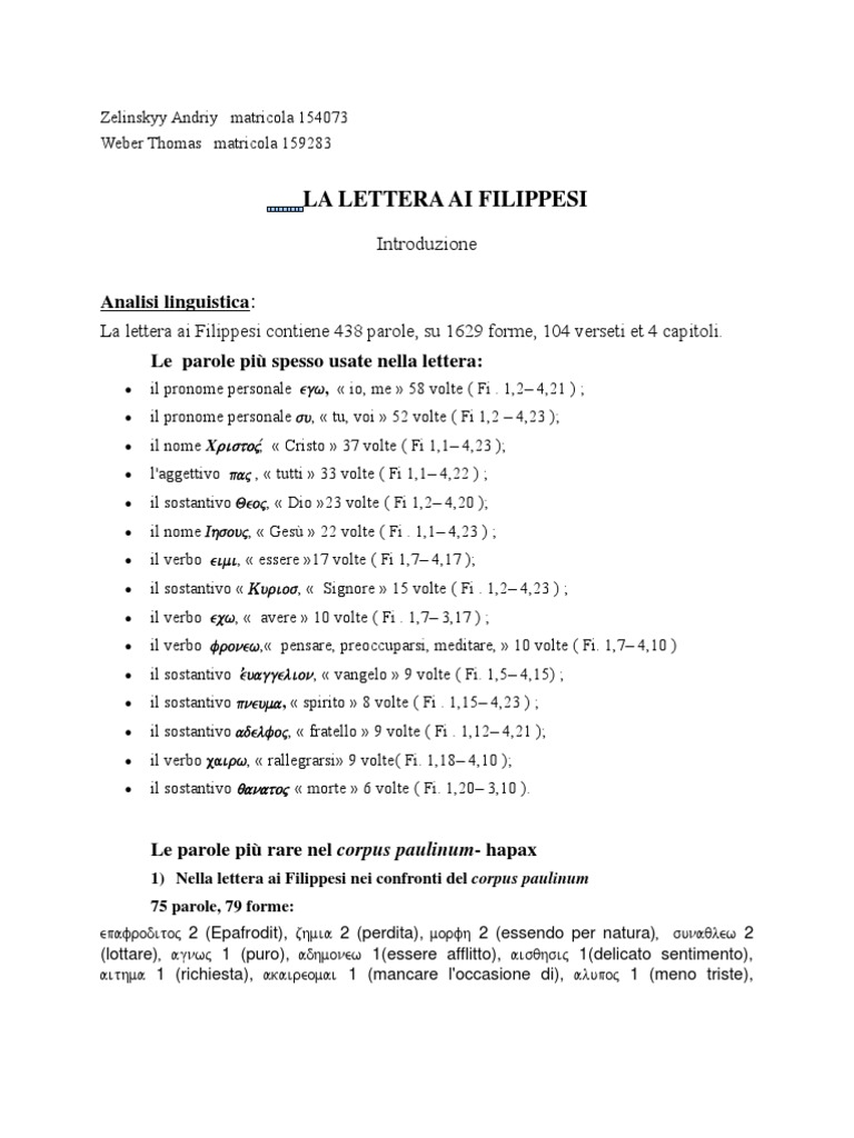 La lettera ai filippesi - 2:5-11 IV. 11. e ogni lingua confessi che Gesù Cristo è il Signore, alla gloria di Dio Padre.". L'inno è poggiato in modo particolare sul parallelismo, che facciamo qui notare: 6. "Il quale, pur essendo in forma di Dio, non considerò l'essere uguale a Dio qualcosa a cui aggrapparsi gelosamente, I. L'umiliazione. Lettera ai Filippesi - Luce Cristiana 2 years The _ga cookie, installed by Google Analytics, calculates visitor, session and campaign data and also keeps track of site usage for the site's analytics report. The cookie stores information anonymously and assigns a randomly generated number to recognize unique visitors. Lettera Ai Filippesi | PDF Capitolo 2 1 - Se dunque è possibile qualche consolazione in Cristo, se v'è qualche conforto dell'amore, se v'è qualche comunanza di spirito, se avete viscere di compassione, 2 rendete compiuto il mio gaudio della concordia vostra, avendo uno stesso amore, una stessa anima, uno stesso sentire; 3 nulla si Lettera ai Filippesi - perfettaletizia.it Scrivere a voi le stesse cose, a me non pesa e a voi dà sicurezza. 2 Guardatevi dai cani, guardatevi dai cattivi operai, guardatevi da quelli che si fanno mutilare! 3 I veri circoncisi siamo noi, che celebriamo il culto mossi dallo Spirito di Dio e ci vantiamo in Cristo Gesù senza