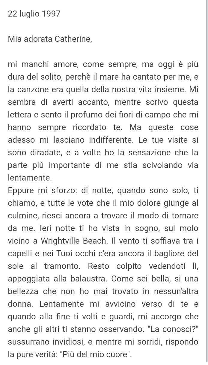 Le parole che non ti ho detto lettera di catherine. Le parole che non ti ho detto - Nicholas Sparks - Google Books Garrett, l'uomo che la firma, ha perso la donna amata e le strazianti parole del suo messaggio insinuano in Theresa una sottile curiosità. Profondamente turbata da emozioni che non riesce a frenare, Theresa si avventura, grazie anche a fortunate coincidenze, in una località turistica della costa alla ricerca del protagonista di questo amore ... Le parole che non ti ho detto | KingFox Lo crede l’autore della lettera, indirizzata a una donna che si chiama Catherine. Scopre che lei è morta ed è proprio la moglie di lui. Scopre anche molto di più… ma come sai, ho deciso di evitare di fare spoiler sui finali. Quindi mi fermo anche questa volta. Ti dico solo che qui la Tempo Box ha fatto il suo dovere… " LE PAROLE CHE NON TI HO DETTO " (lettera di Sabrina Morelli ... #sabrinamorelliLE PAROLE CHE NON TI HO DETTO Di notte mi ritrovo sola in una vita che non ho scelto, ripenso a tutto quello che avrei voluto, desiderato co... Le parole che non ti ho detto – quarta lettera | Il ricordo ... Oct 7, 2010 · Le parole che non ti ho detto – quarta lettera Cara Theresa, puoi perdonarmi? In un mondo che comprendo di rado, i venti del destino soffiamo quando meno ce lo aspettiamo. A volte hanno la furia di un uragano, a volte sono lievi come brezze. Ma non si possono negare, perchè spesso portano ad un futuro impossibile da ignorare.