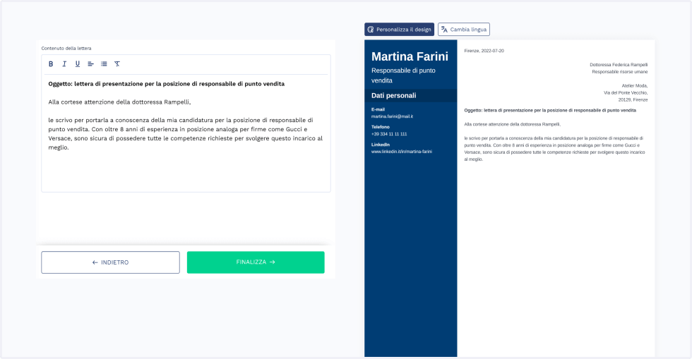 Lettera di presentazione: esempi, modelli e consigli 24 Jan 2023 — Sai perché scrivere una lettera di presentazione da affiancare ad un buon Curriculum Vitae è importante? E soprattutto come scriverla per ... Come scrivere una lettera di motivazione (con esempio) 10 Aug 2022 — Al contrario del curriculum, la lettera di presentazione non deve contenere tutti i dettagli sulla tua storia accademica e lavorativa, ma deve ... Come scrivere una lettera di presentazione - CVapp.it Una frase d'apertura come “con la presente vorrei sottoporre alla vostra attenzione la mia candidatura per il ruolo di [posizione] presso [azienda] ” rischia di ...