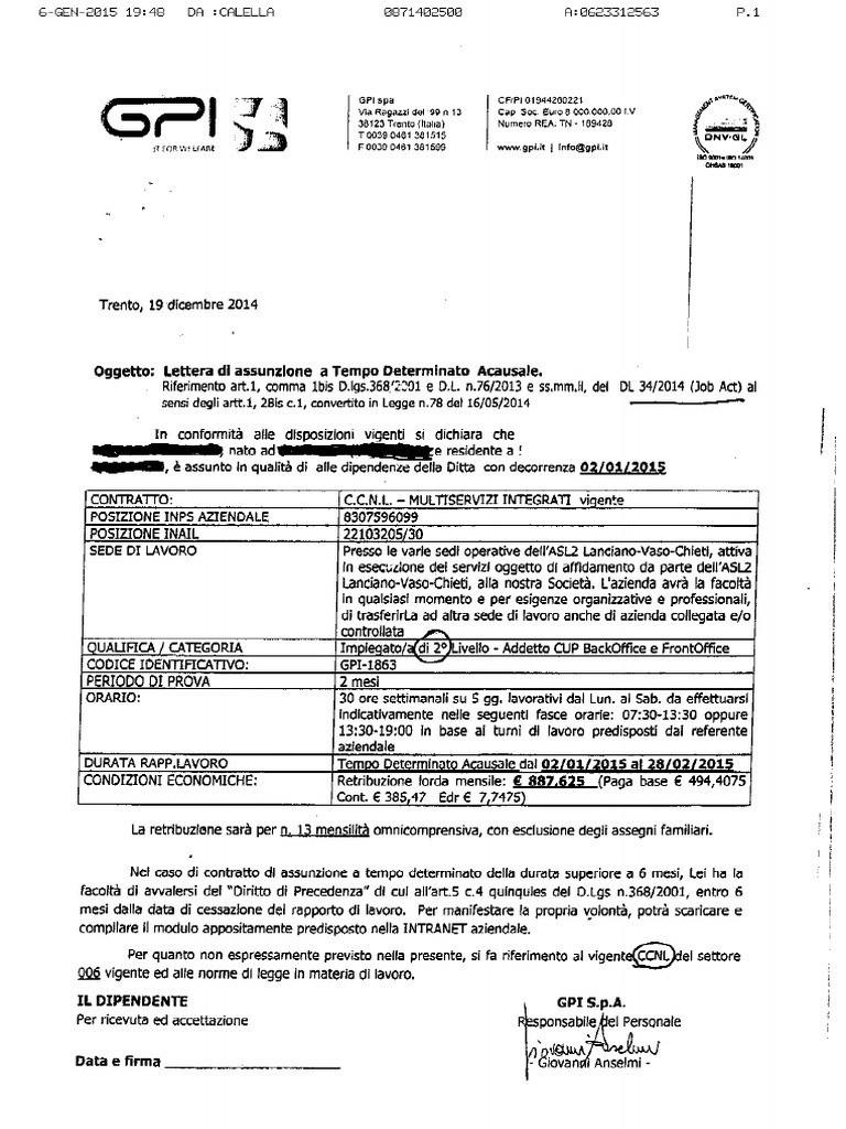 Lettera assunzione tempo determinato 2015
