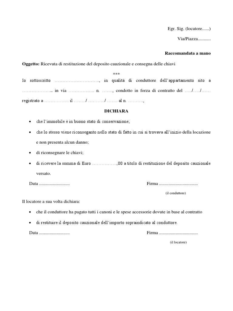 Lettera restituzione deposito cauzionale locazione. Modulo restituzione cauzione 2.pages - Gaeta in vacanza RICEVUTA DI RESTITUZIONE DEL DEPOSITO CAUZIONALE E CONSEGNA DELLE CHIAVI ... nello stato di fatto in cui si trovava all'inizio della locazione e. mod. richiesta di rimborso deposito cauzionale - ATER Teramo RESTITUZIONE DEPOSITO CAUZIONALE: A richiesta dell'interessato ,l'ATER restituisce all'atto della cessata locazione il deposito cauzionale. Tale svincolo è. Lettera Riconsegna Caparra - Modello - Word e PDF - Wonder.Legal Attraverso questo documento il locatore dichiara di riconsegnare la caparra al conduttore. La caparra, o deposito cauzionale, serve a garantire al locatore ... Richiesta restituzione caparra affitto - Laleggepertutti Jun 21, 2020 ... Indicheremo, innanzitutto, le condizioni che legittimano il locatore a trattenere il cosiddetto “deposito cauzionale” o cauzione; poi, ...